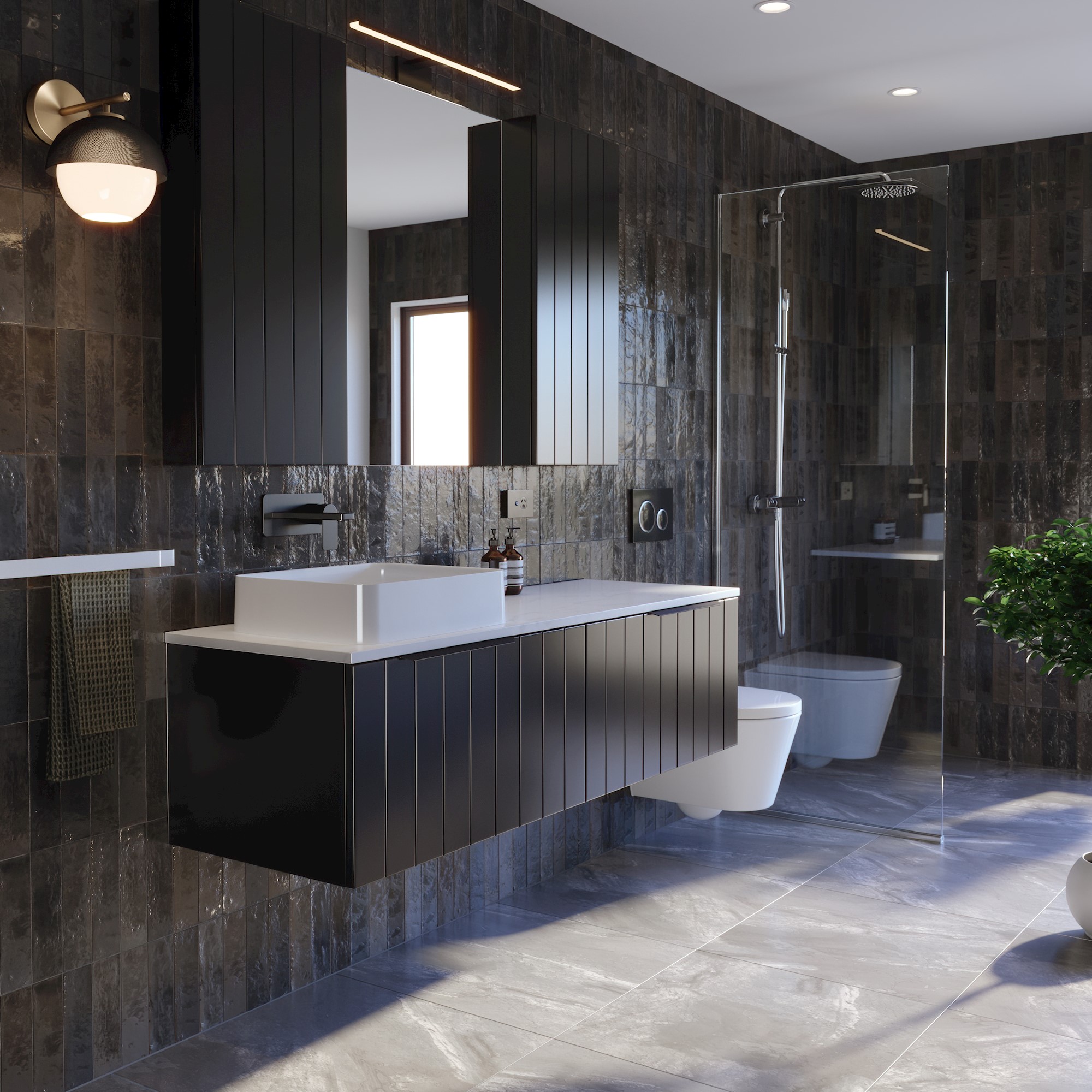 Savoy 50 Benchtop 1500L Wall 2Dr / 9018BT3-F3 Basin / smartB 7414 Gloss White Top / Cherry Pie Carrara Savoy Mirror 1500 2D / 9161-F3 Setting Colour / Black Satin Handle / Blaze 2 Matte Black Tapware / Jamie J Cosmopolitan Wall Basin Set Matte Black