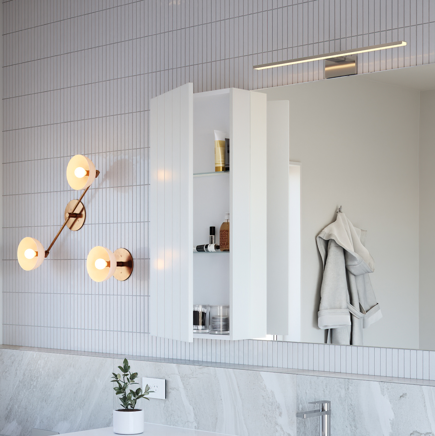 Savoy 50 Benchtop 1800L Wall 2Dr + Right Concealed Dr / 9032BT3-F3 Basin / smartB 7402 White Gloss Top / Cherry Pie Bright White Savoy Mirror 1800 2D / 9163-F3 Setting Colour / Villa Blue Tapware / Greens Textura Wall Basin Mixer w/plate Brushed Brass