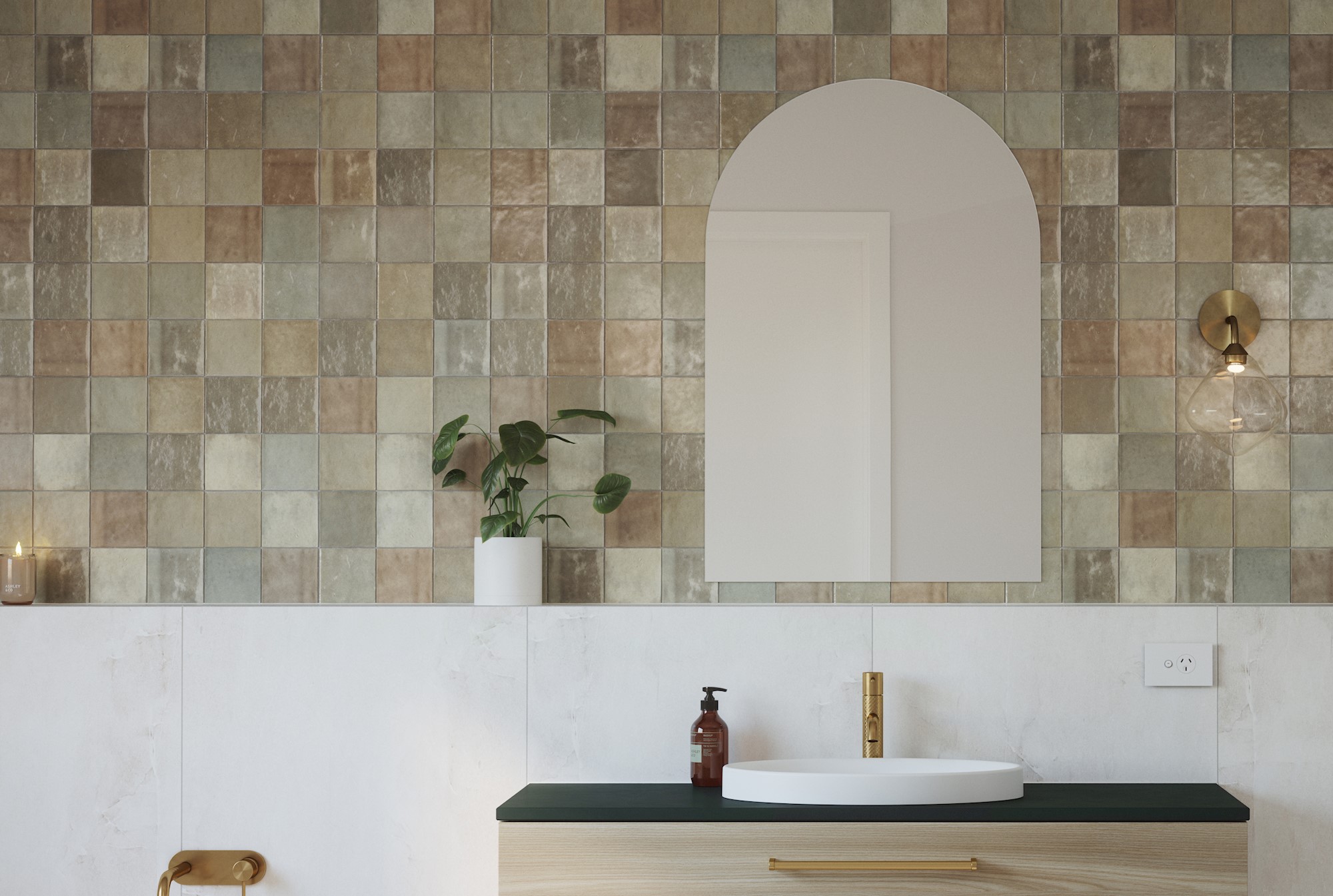 Ivy 50 Benchtop 1200 Wall 1Dr / 9188BT2-F2Basin / Dignity Matte WhiteTop / Wicked Soft-MatteSolo Arch 600 / 87524Setting Colour / Vintage AshHandle / Velik Pearl Gold