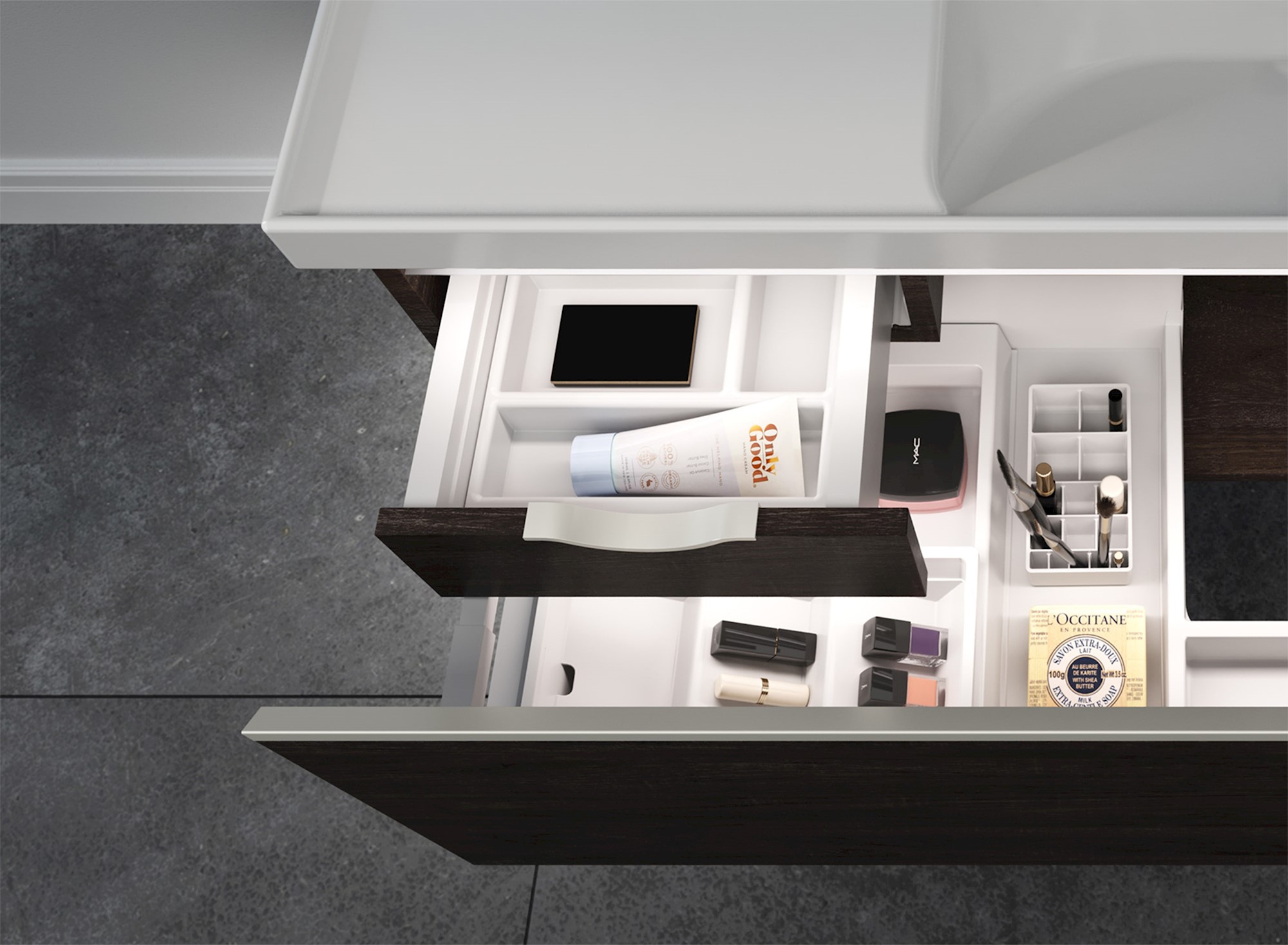 Strategic in-built lighting makes Dusk cabinets a joy to use. LED accent strips provide low-level ambient light and visual sophistication, and when you open a drawer or cupboard the gentle glow helps you to find things. Dusk cabinets combine beautifully with our Daylight mirror lights, to deliver the ideal illumination for makeup application. Includes Onda storage.