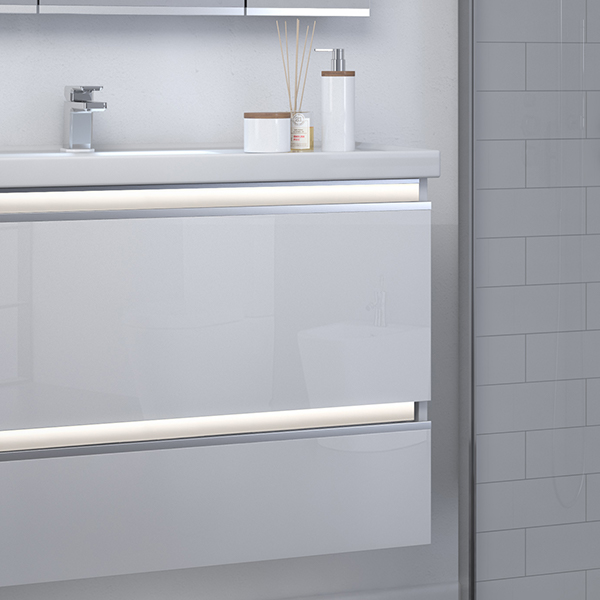 If you prefer a cabinet with handles, but still want the sophistication of LED lighting, our Dawn range is an elegant solution. The LED panel is integrated into the base of the cabinet to provide a soft glow of downlighting, which is enough for night-time navigation and many bathroom tasks. Includes Onda storage.