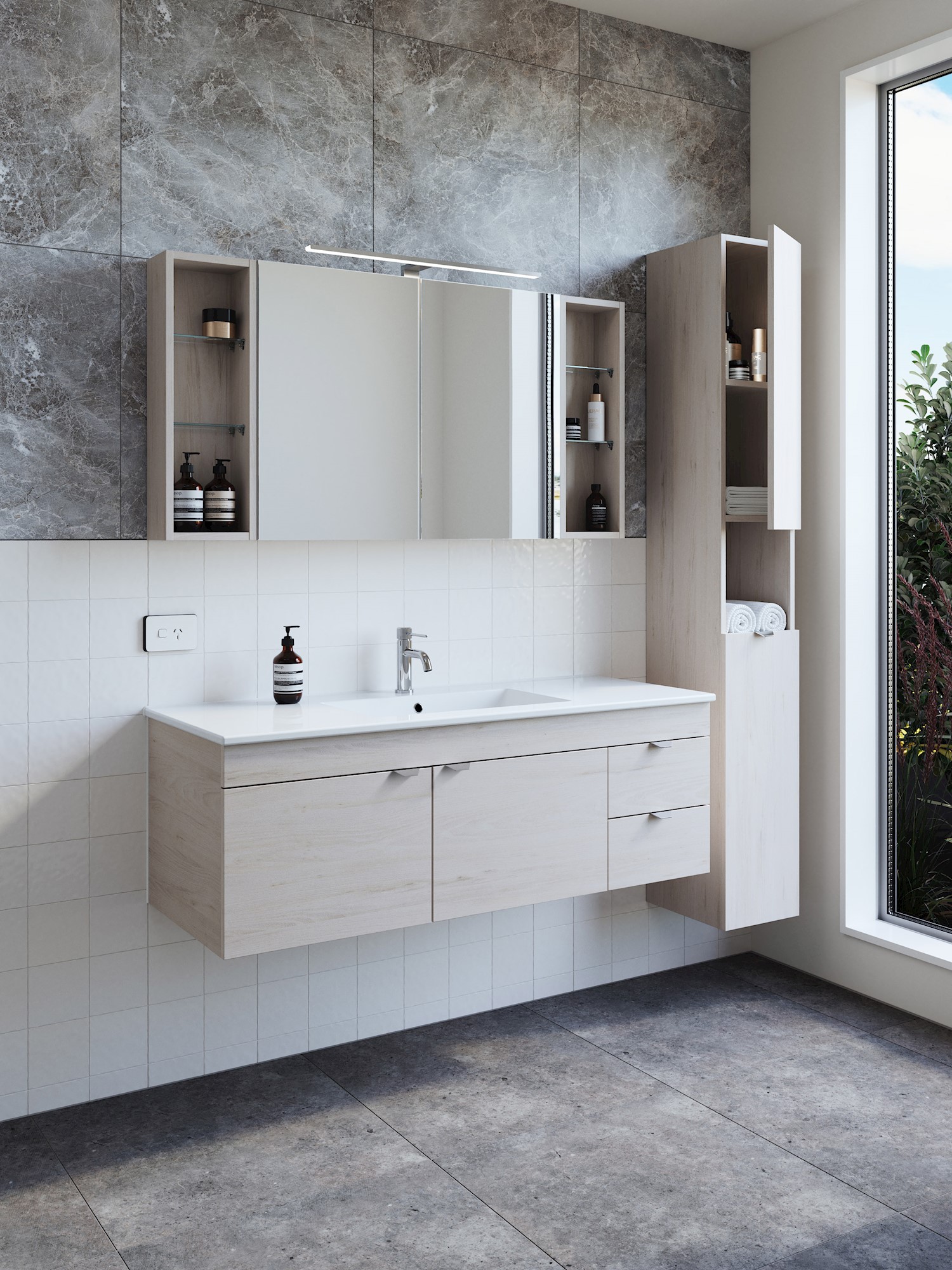 Presenting a sleek take on a traditional style, the Riko offers a selection of door and drawer configurations in various sizes available in both wall and floor options. Tailored to suit the unique needs of your bathroom space. Every model includes the luxury of soft-close doors or drawers.