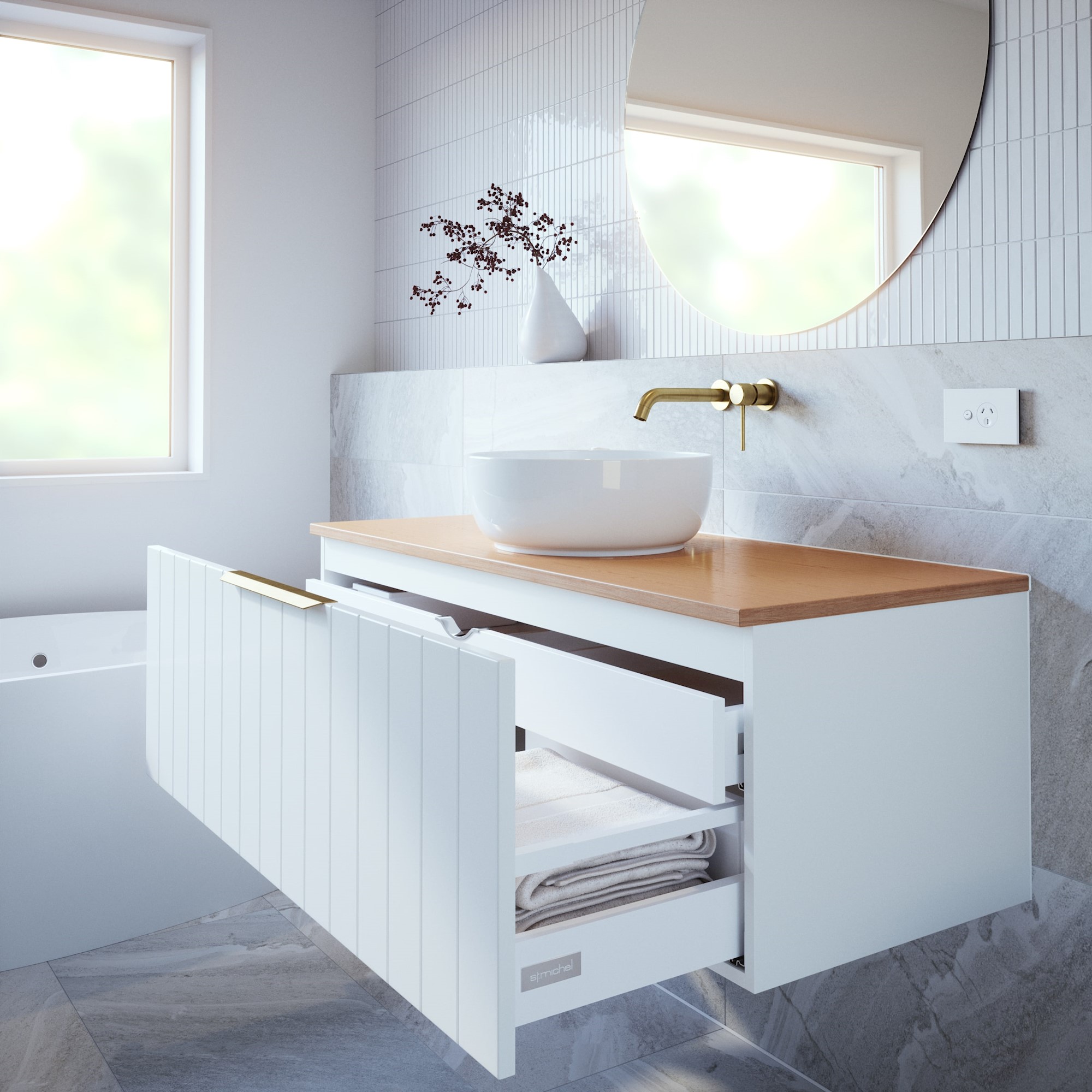 With more than 30 basin options to choose from, the Savoy 50 benchtop offers immense scope for personalisation. It also maximises storage with concealed drawers and Onda storage systems.