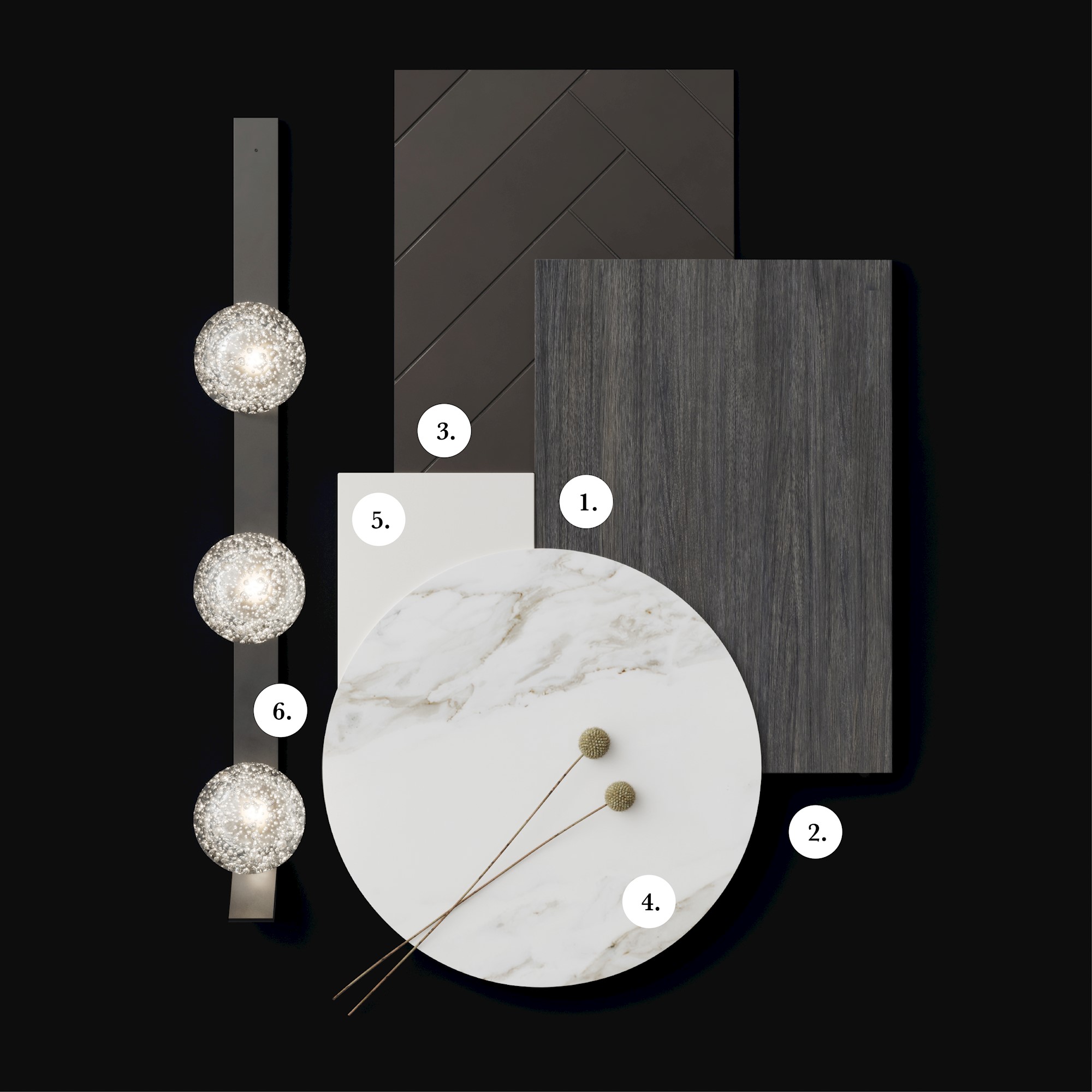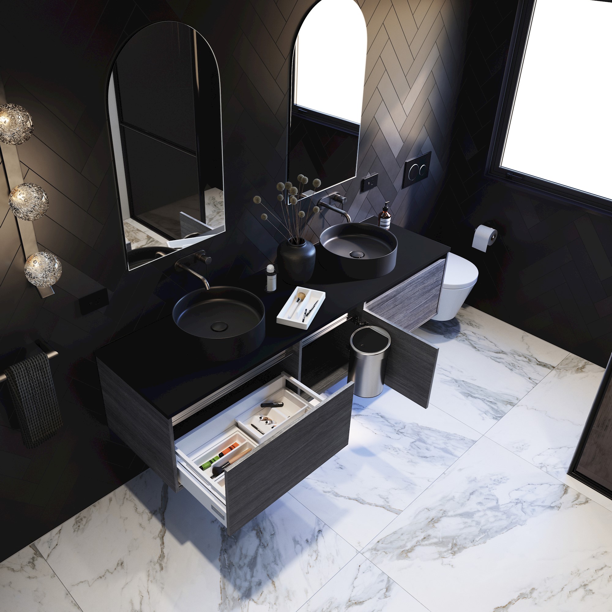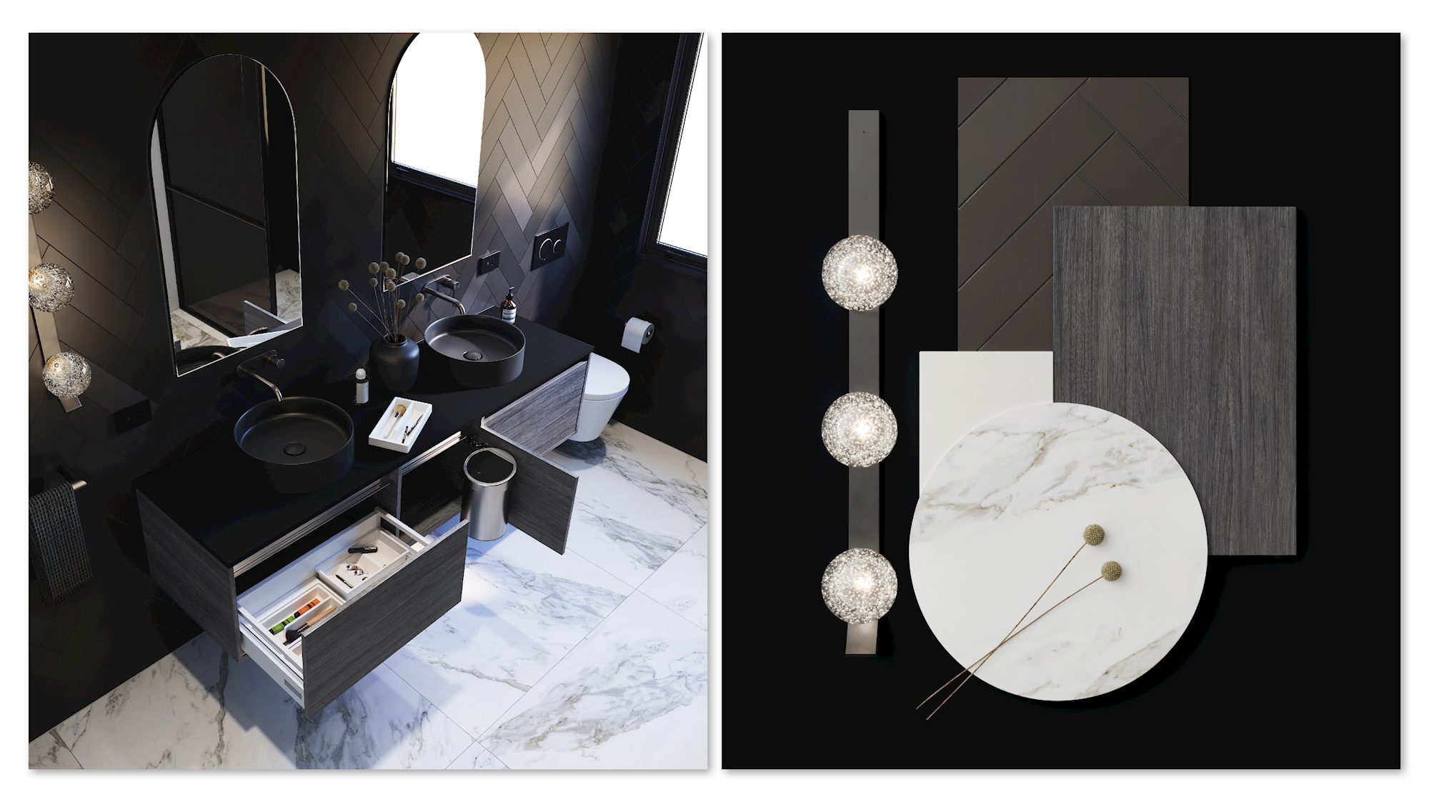 A duo that’s modern and refined. Bold Black grounds the look, while Smoked Ash layers in smoky sophistication, creating tonal depth perfect for contemporary bathrooms and interiors.